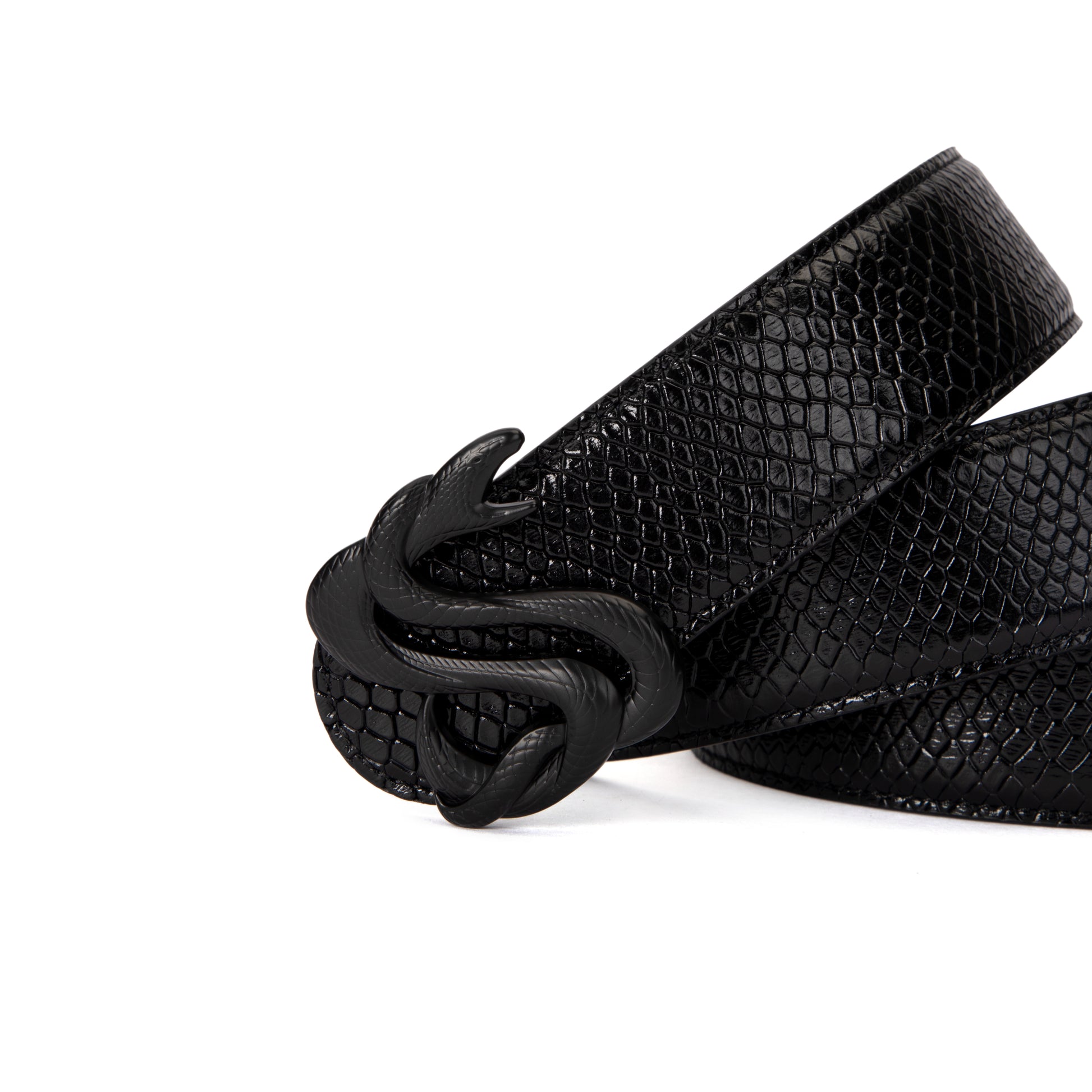 Make a lasting impression with the Midnight Black Snakeskin Bely by Suave Suede. Crafted from 100% cowhide stampede leather with a snakeskin texture, this bold design features a sleek high-shine black finish paired with a matte black serpent buckle for a striking monochromatic statement.